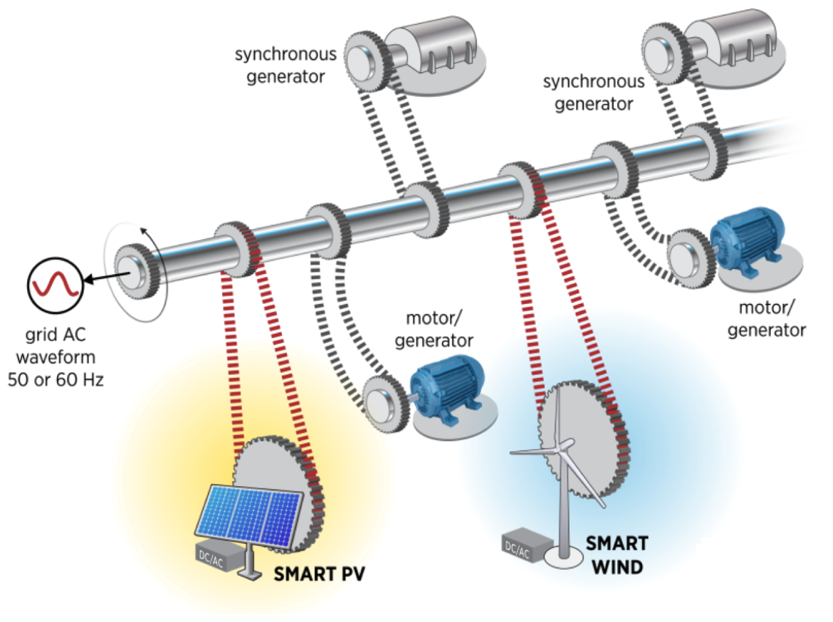 Figure 1. The representation of an electric power system showing tight coupling of synchronous generators and smart variation renewable energy systems.(Image source: NREL)