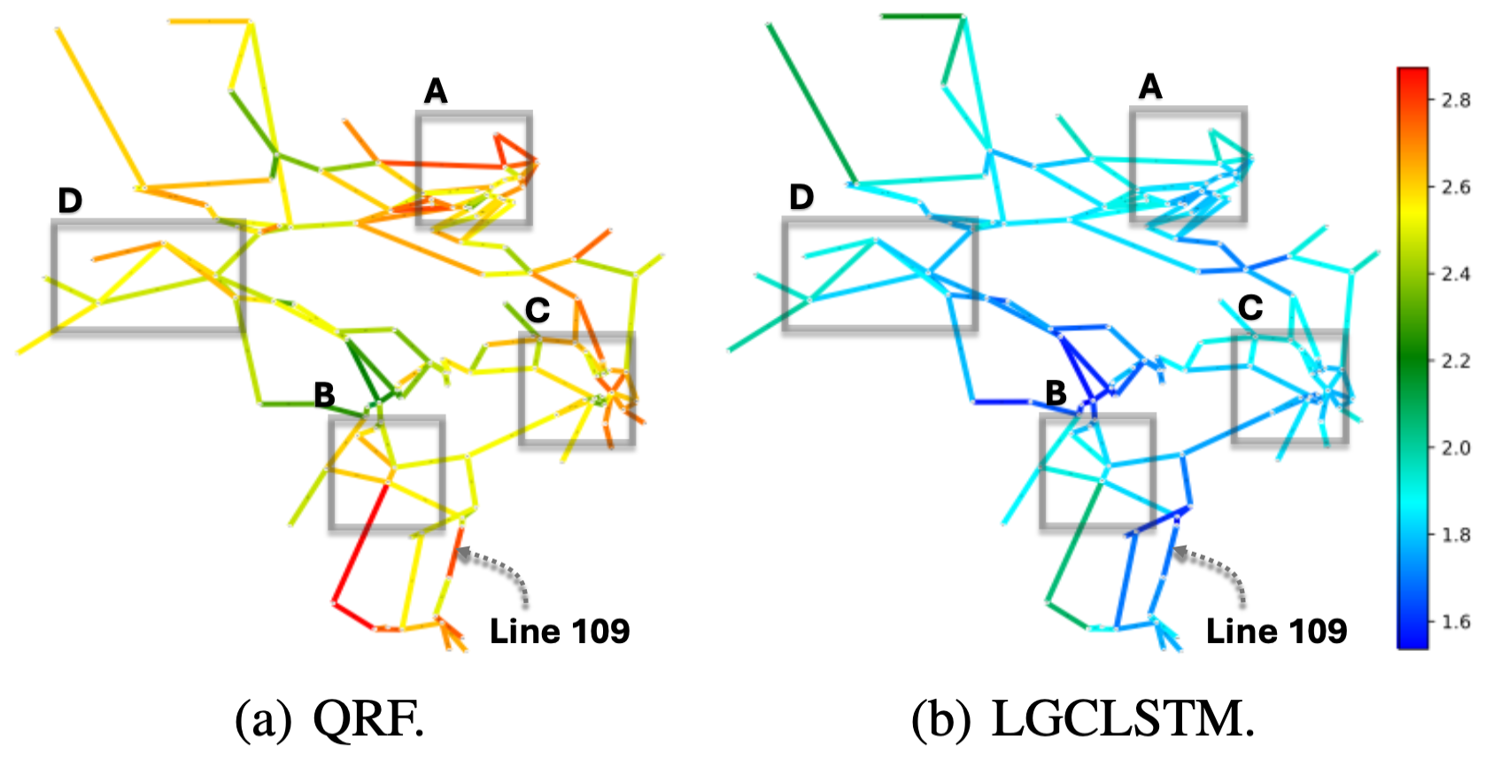 QRF struggles in dense regions (A–D) due to no spatial modeling, while LGCLSTM greatly improves performance!